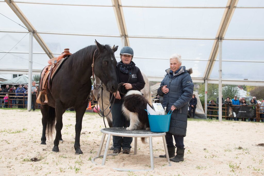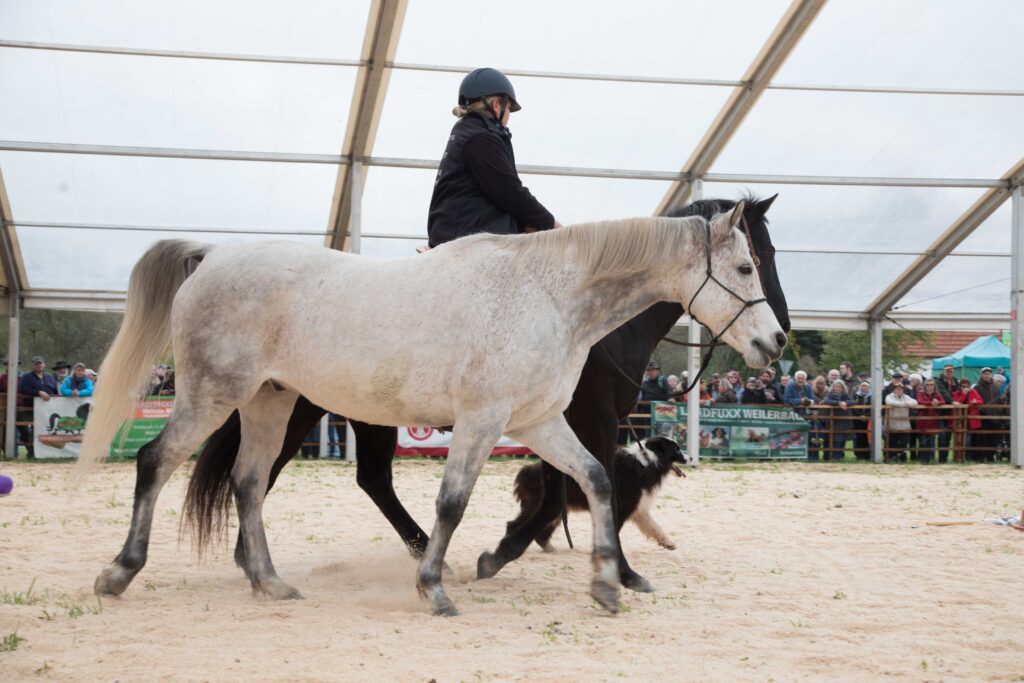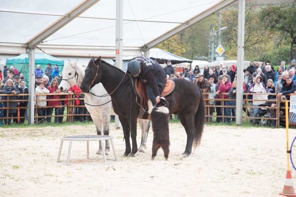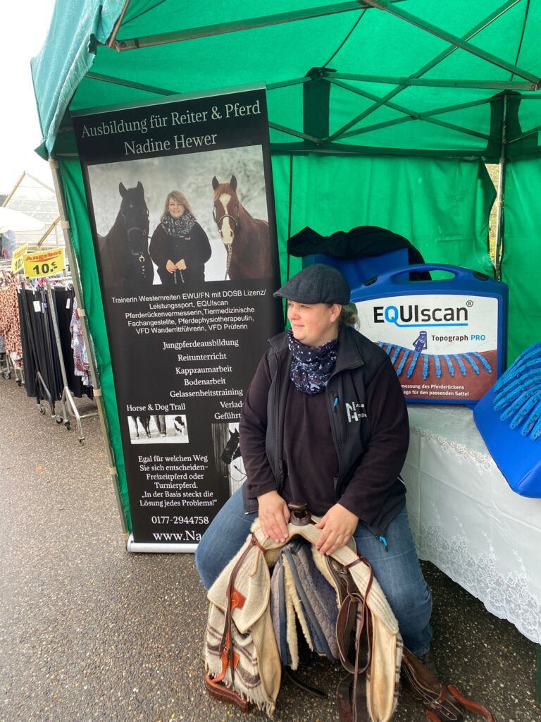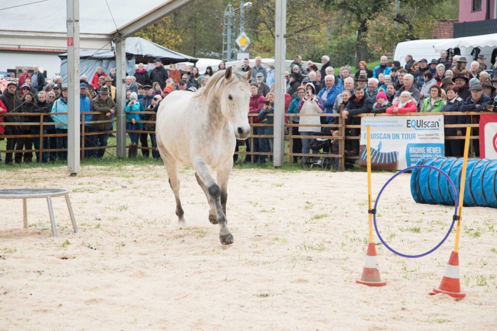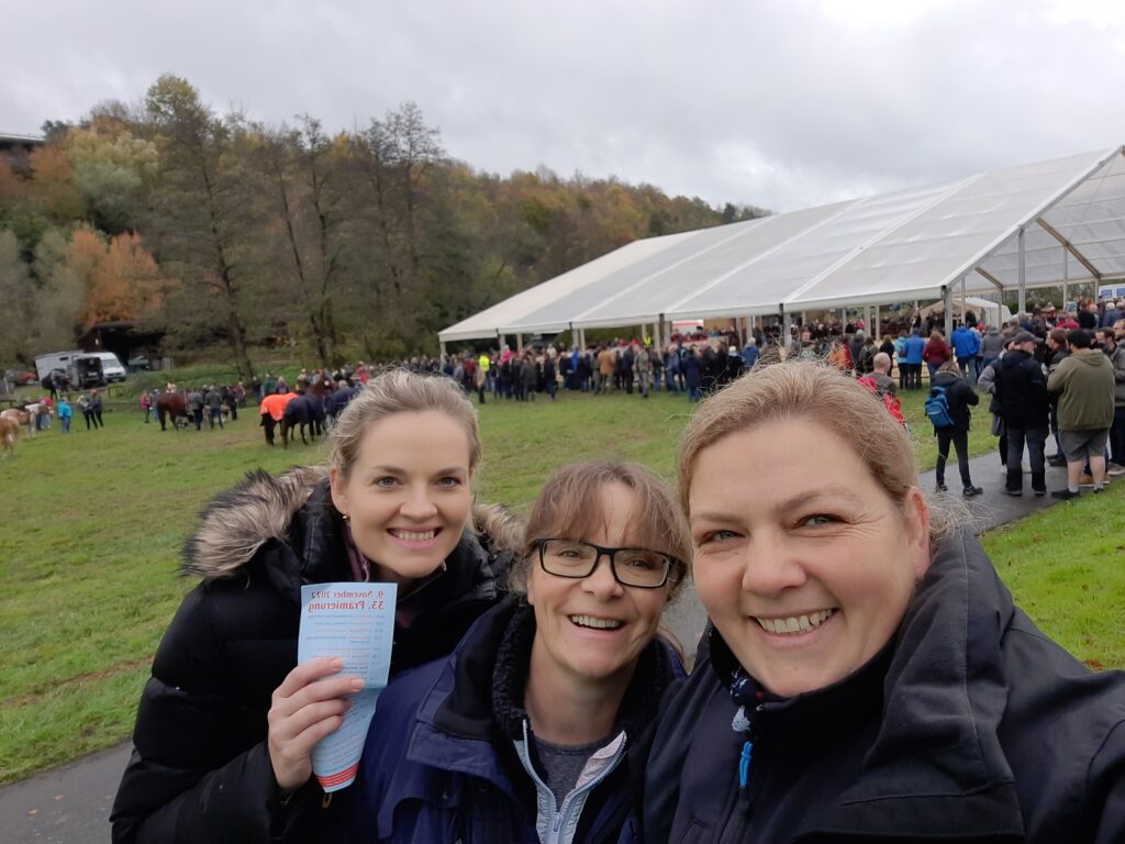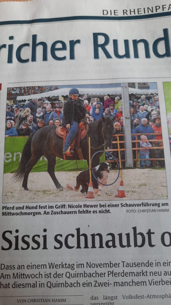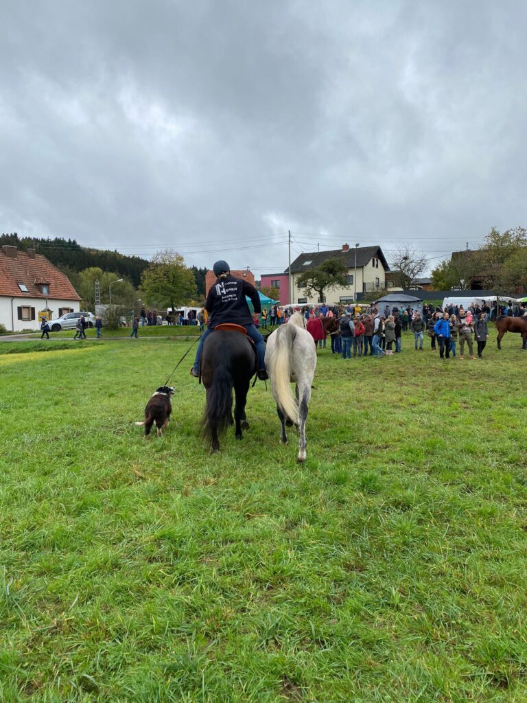 Viele Jahre machte Corona dem Pferdemarkt den Gar aus. Doch 2022 sollte er wieder stattfinden und die VFD-Saar war mit dabei. Im Morgengrauen baute das Messeteam den Stand auf, der zum Besuchermagnet und zum Treffpunkt für die Mitglieder werden sollte. Die schlimmsten Befürchtungen auf Dauerregen bestätigten sich nicht, der Wettergott meinte es gut mit den Quirnbachern. Im nu war die ganze Straße mit Ständen zugebaut, meistens Klamotten und anderer Klimbim. Aber hinter unserem Stand tummelten sich schon früh einige Pferde und es wurden immer mehr. Viele wollten zur Prämierung und so wurden Shetties, Haffis, Norweger, Warmblüter, Kutschpferde, Kaltblüter, Araber, QH, Paint und viele mehr dort prämiert. Zwischendurch sorgte ein umfangreiches Schauprogramm für Abwechselung. Der Höhepunkt des Schauprogrammes war die Schaunummer von Nadine Hewer, die eindrucksvoll die Arbeit mit Pferd und Hund zeigte. Das Publikum war begeistert.
