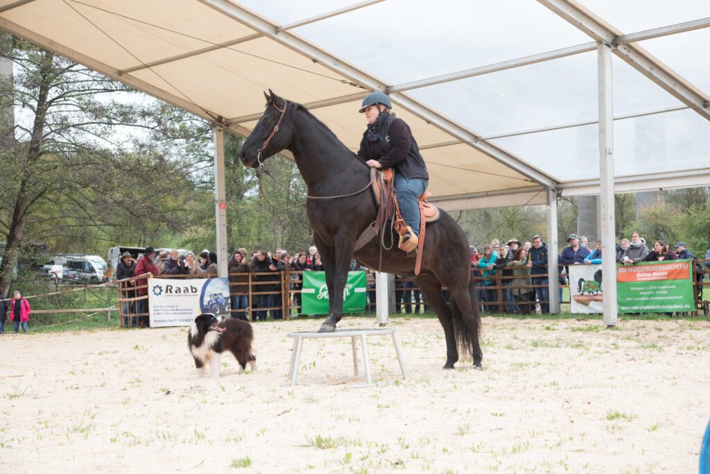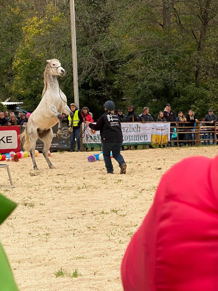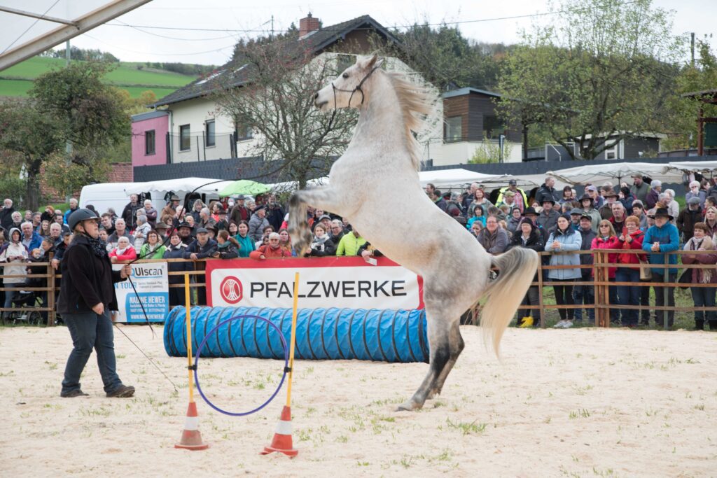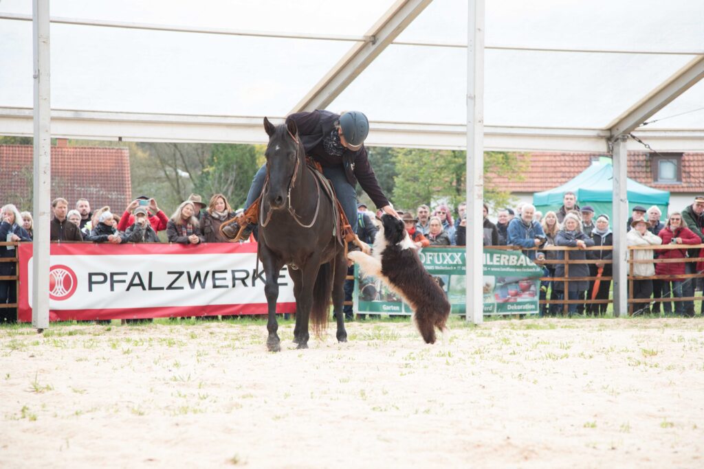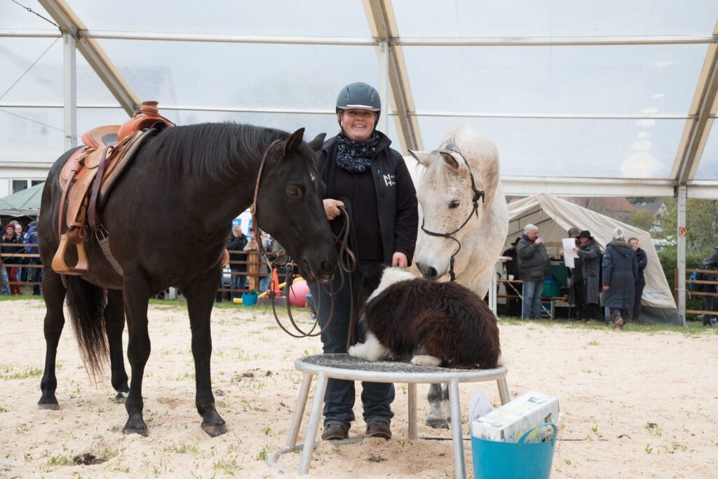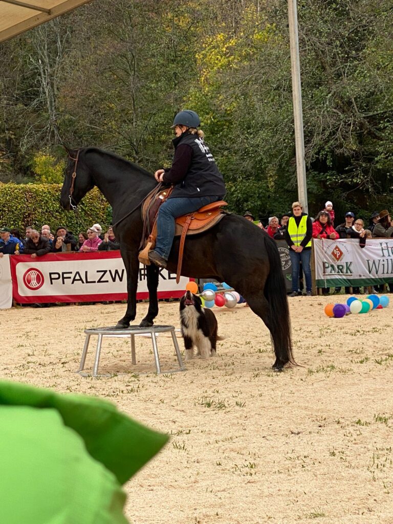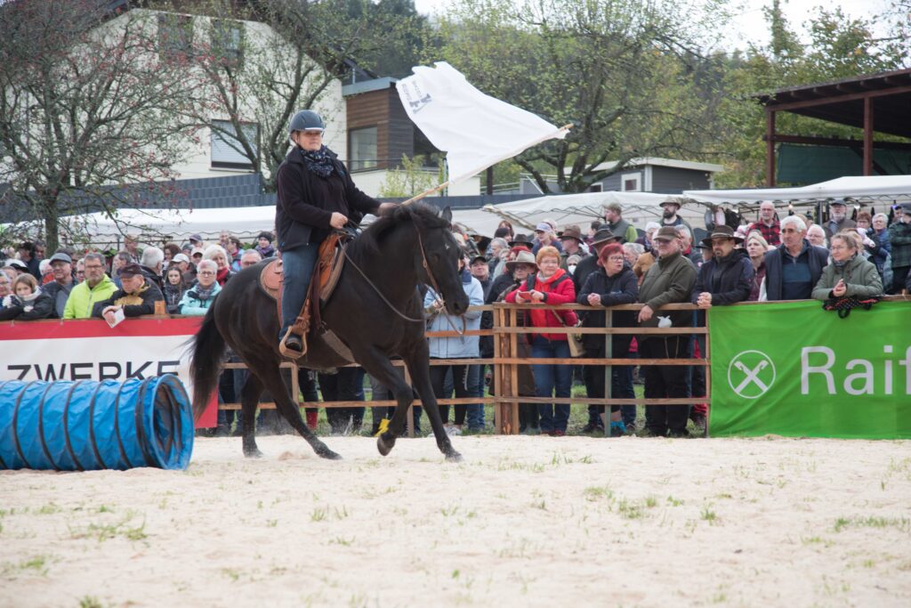 Viele Jahre machte Corona dem Pferdemarkt den Gar aus. Doch 2022 sollte er wieder stattfinden und die VFD-Saar war mit dabei. Im Morgengrauen baute das Messeteam den Stand auf, der zum Besuchermagnet und zum Treffpunkt für die Mitglieder werden sollte. Die schlimmsten Befürchtungen auf Dauerregen bestätigten sich nicht, der Wettergott meinte es gut mit den Quirnbachern. Im nu war die ganze Straße mit Ständen zugebaut, meistens Klamotten und anderer Klimbim. Aber hinter unserem Stand tummelten sich schon früh einige Pferde und es wurden immer mehr. Viele wollten zur Prämierung und so wurden Shetties, Haffis, Norweger, Warmblüter, Kutschpferde, Kaltblüter, Araber, QH, Paint und viele mehr dort prämiert. Zwischendurch sorgte ein umfangreiches Schauprogramm für Abwechselung. Der Höhepunkt des Schauprogrammes war die Schaunummer von Nadine Hewer, die eindrucksvoll die Arbeit mit Pferd und Hund zeigte. Das Publikum war begeistert.