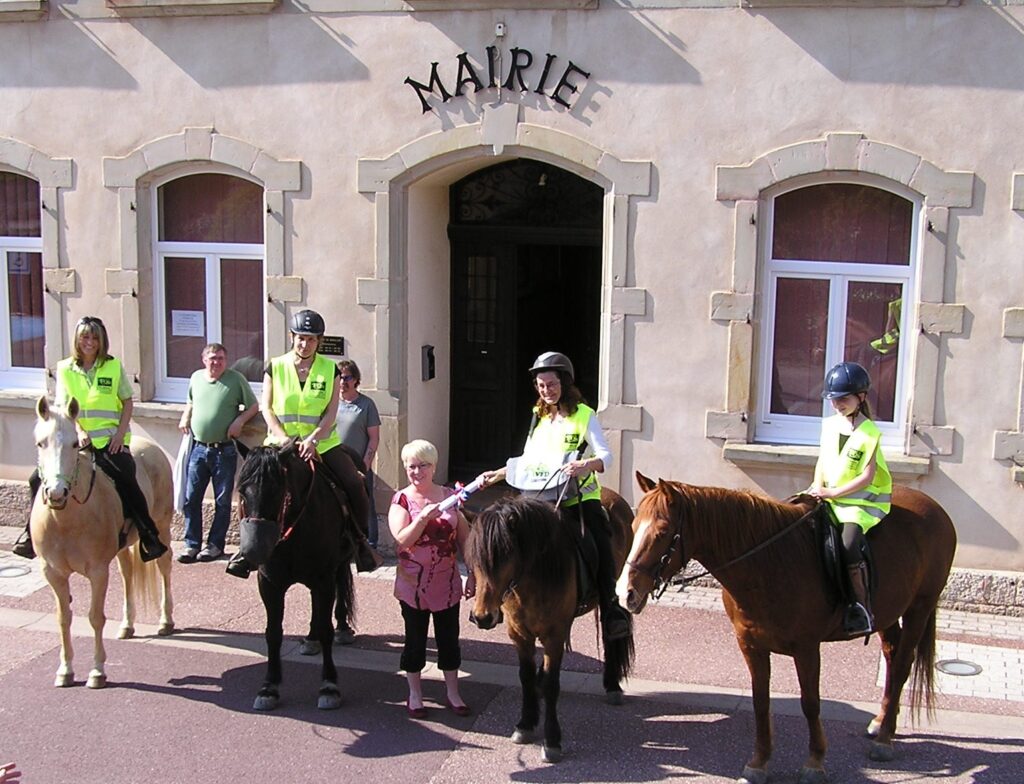 in Berviller in Frankreich wird die Bürgermeisterin unsere Charta in französischer Sprache unterschreiben. Das Schriftstück holen wir um 14.00 Uhr beim Berviller Dorffest an der Mairie ab und anschließend wird dann in der Stafetten-Tasche zu Pferden an das Denkmal der „Großen Europäer“ nahe Berus gebracht. Dort, am Mahnmal für die Europäische Freundschaft, wird die Tasche an die deutschen Reiter übergeben. Ihr könnt mit zum Dorffest in Berviller kommen und von dort aus zum Europadenkmal reiten
