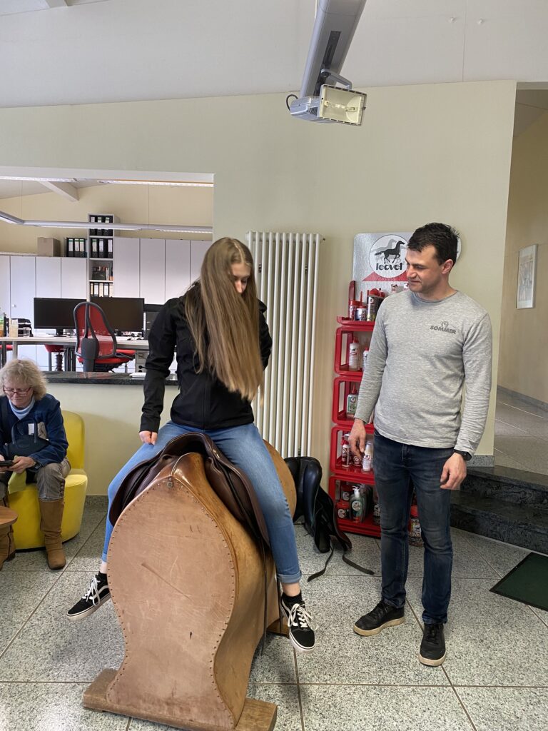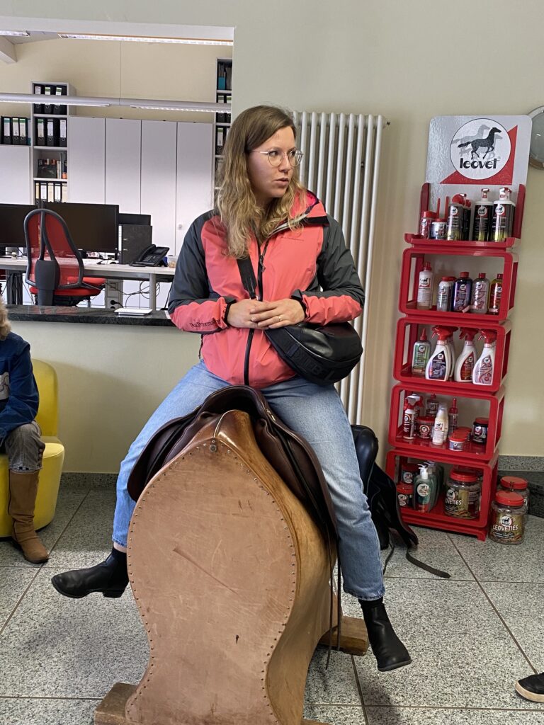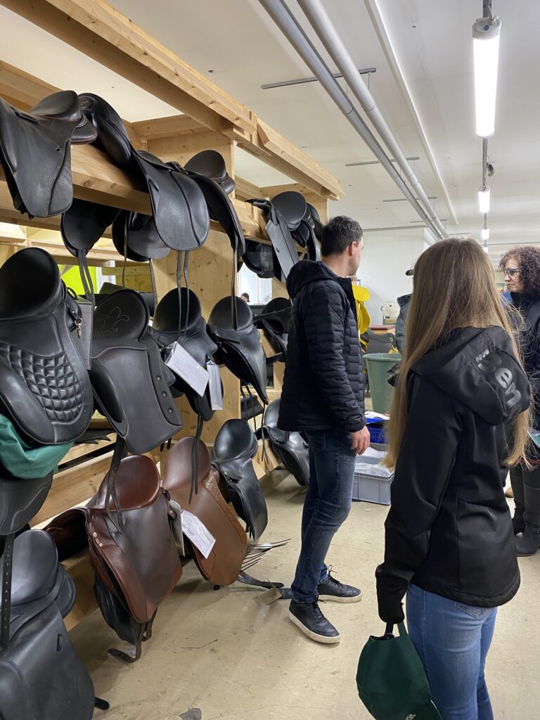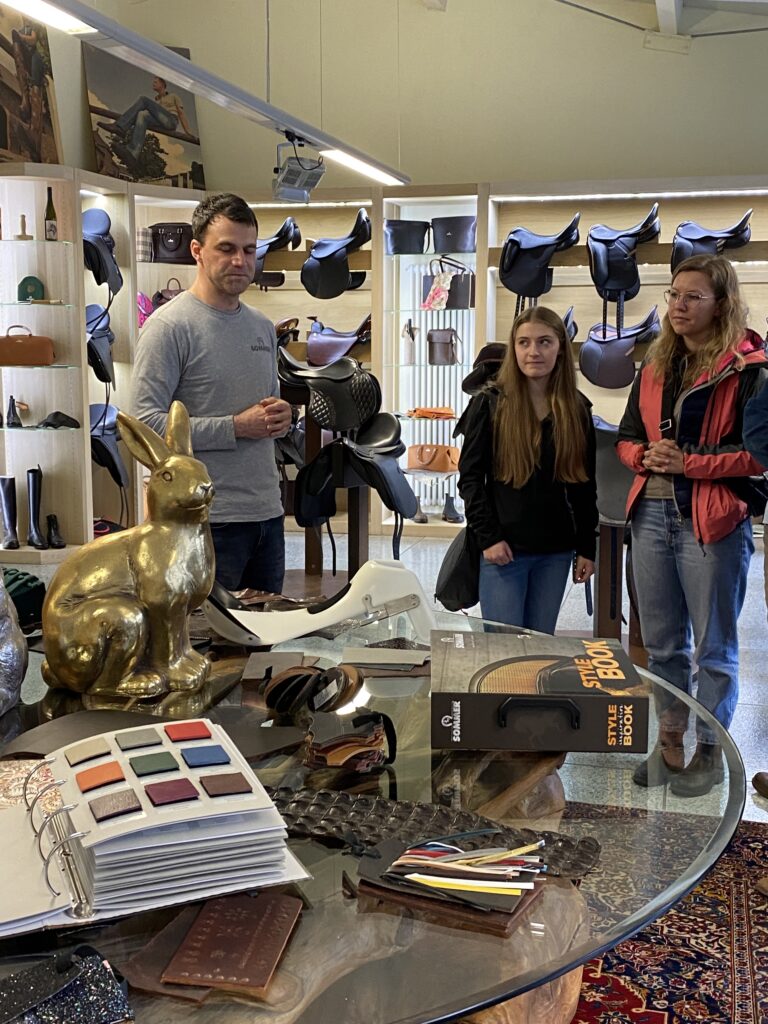 Zuerst trafen wir uns in der Ausstellung der Sattlerei und durften viele wunderschöne Sättel und Zubehör anschauen. Wir staunten über ausgefallene Farben und Formen und welche Vielfalt Firma Sommer anbietet. Die Erklärungen von Herr …. waren sehr informativ, er beantwortete alle unsere Fragen geduldig.