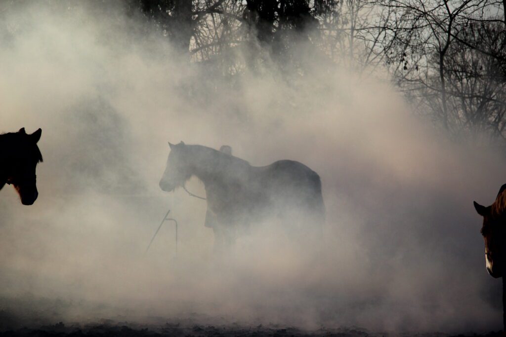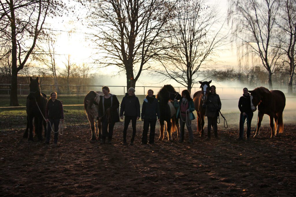 Während der Übung lernten wir weiter, unsere Pferde möglichst optimal zu lesen – und sie so zu unterstützen, dass sie uns sogar in diesen Momenten wörtlich „blind“ vertrauen könnten. Denn mitten im Nebel, war jedes Mal kurzzeitig tatsächlich nichts mehr zu sehen. Nachdem alle zunächst stehen blieben, konnten wir kurz darauf bereits mitten durch die Nebelschwaden mit gelassenen Pferden wandeln… Mit der langsam sinkenden Sonne im Hintergrund, wurde es hier nochmal so richtig magisch und verwünscht.