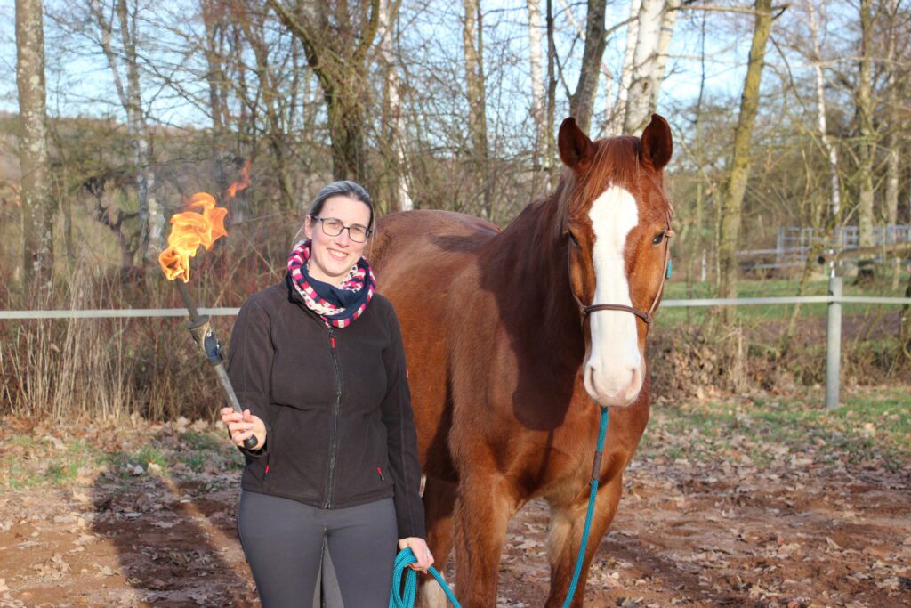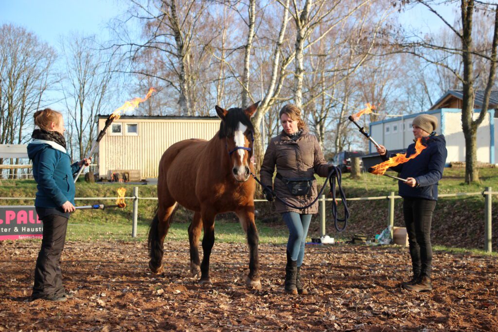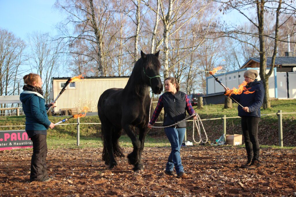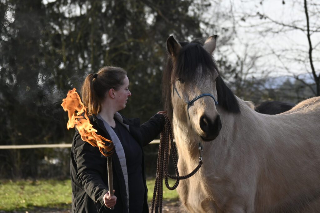 Im Praxisteil konnte die umfangreiche Theorie direkt angewendet werden. Beobachten, einschätzen, das Pferd korrekt lesen und die optimale Hilfestellung geben können. Denn hier wurden wir mit unseren Pferden an das Element Feuer herangeführt: Fackeln, eine Feuerschale und ein brennendes Boden-Seil galt es mit nahezu allen Sinnen zu erfassen. Nur wenige Sinne, wie das Schmecken, durften jedoch nicht getestet werden… Auch wenn mein junges Pferd Theseus (4,5 Jahre) das auch gerne wollte. Doch das wäre wohl eher kontraproduktiv gewesen. Denn im absoluten Vordergrund stand die Sicherheit aller Teilnehmer und Pferde zu jeder Zeit. Unter der wundervollen Anleitung von Svea, durften wir teilweise magische Momente mit unseren Pferden erleben. Die Übungen wurden für alle sinnvoll und gut nachvollziehbar aufgebaut. Sowohl die jungen Pferde (3,5 und 4,5 Jahre), als auch die erfahreneren Pferde (9, 14 und 16 Jahre) fassten die verschiedenen Übungen sehr unterschiedlich auf. Und gerade er jüngste überraschten nach kurzer Aufregung (dies war sein erster Kurs) mit großem Mut. Allen Pferden konnte an diesem Tag das Element Feuer mit Ruhe und Feingefühl gezeigt und entspannt vermittelt werden. Das waren wirklich tolle Erlebnisse.