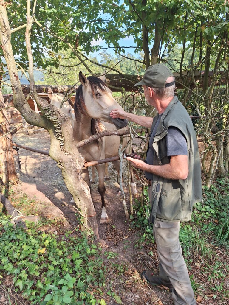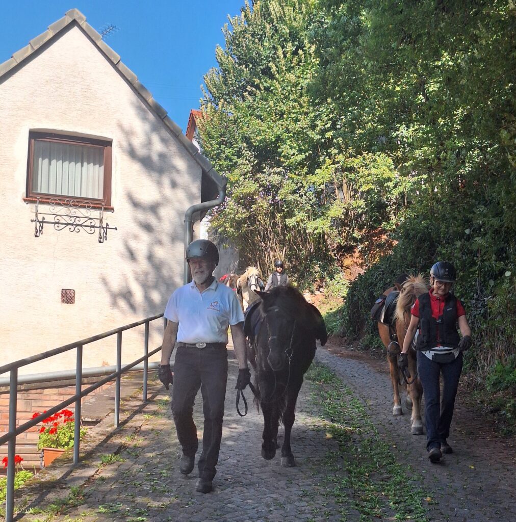Am zweiten Tag stand das Schützenhaus in Annweiler als Mittagsrast auf dem Programm. Gräfenhausen wurde kurz gestreift und ein Brunnen zum Tränken genutzt. Unterhalb des Krappenfelsens gab es erneut viel Schotter auf den Waldwegen und dann wurde unmerklich hoch oben der Tunnel der B10 gequert. Hinter dem Turnerheim erreichten die Reiter das Schützenhaus, wo es leider keine guten Möglichkeiten zum Anbinden der Pferde gab. Aber für ein Stück Kuchen ist ja immer Zeit. Gut gestärkt traten die Reiter den Heimweg an, aber nur für wenige Meter. Dann versperrten umgestürzte Bäume den Weg und es ist kein Durchkommen. Jürgen packte die Säge aus und räumte den Weg getreu dem Motto: wir machen den Weg frei. Weit ging es nicht voran, denn vor dem Hahnenbacher Hof lag wieder ein Baum quer, der aber einen riesigen Durchmesser hatte. Da versagte selbst Jürgens scharfe Säge. Also Umweg nehmen bis zum Hahnenbacher Hof. Dann führte die Strecke entlang der Weinberge wieder zurück zum Vogelstockerhof. Nachmittags stand ein Highlight auf dem Programm: zuerst Spaziergang durch den botanischen Garten mit exotischen Pflanzen und riesigen Mammutbäumen an der Klinik in Gleisweiler. Dann Weiterfahrt nach Hainfeld in das Gasthaus „Zum Logel“, das eine ganz besondere Küche anbietet. Echt einen Besuch wert.
