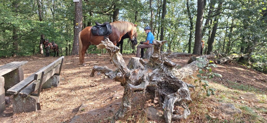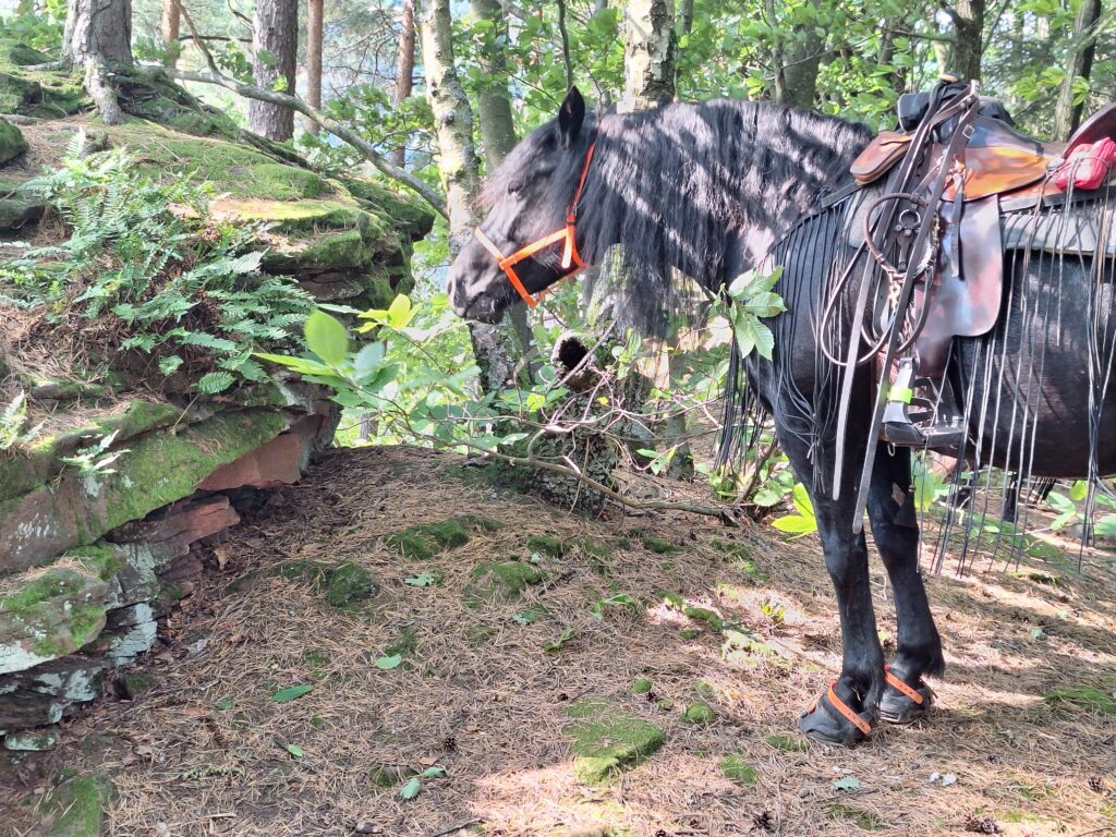Und schon war der letzte Reittag angebrochen, der zum Orensfelsen führte. Mit 650 Höhenmetern war das die steilste Reitstrecke dieser Tour. In nördlicher Richtung liegt Dörrenbach, das wir kurz durchquerten. Und schon geht es stetig bergan durch das Leinbachtal zur Landauer Hütte. Ab hier wurde es noch steiler und im Schritt erkletterten die Pferde den Orensberg. Von der Absprungstelle der Paraglider hatte man einen schönen Blick auf den Vogelstockerhof. Doch es geht noch weiter bergan. Von 220 Meter sind wir auf 560 Meter geritten bis wir den Orensfels erreicht hatten. Eine kurze Pause war notwendig, denn ein Isländer schnaufte gehörig und musste sich erst einmal ein wenig ausruhen. Die Pause nutzten wir zum Besteigen des Orensfelsens mit einer Aussicht bis nach Annweiler und über die Trifelsburgen. Geführt ging es dann stetig bergab zur Hütte Am Kiesbuckel, wo die eigentliche Pause geplant war. Von hier aus waren es nur noch wenige Meter zurück zum Vogelstockerhof. Eine Teilnehmerin nimmt dann noch die Gelegenheit wahr und reitet einen Speed Racking Hengst zur Probe, eckt spektakulär.
