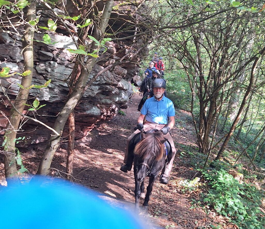 Der dritte Tag führte zur Jungpfalzhütte und unterhalb des Sommerfelsens gab es endlich viele naturbelassene Wege, die zum Trab und Tölt einluden. Der steile Aufstieg zur Hütte lohnte sich, denn die Sicht über den Pfälzer Wald war grandios, ebenso der Kuchen. Der Adelberg wurde umrundet auf naturnahen Wegen bis zum Kammstein. Oberhalb von Gräfenhausen führte die Strecke in östlicher Richtung am Rothenkopf vorbei und da hatet er uns wieder, der Schotter. So kennen wir das vom Pfälzer Wald eigentlich nicht. Das Abendprogramm führte nach Annweiler und zu Fuß wurde die Altstadt erkundet. Natürlich endete der Spaziergang erst einmal an der Eisdiele, die ganz besondere Eissorten anbietet. Dann klang der Abend im Gasthaus aus.