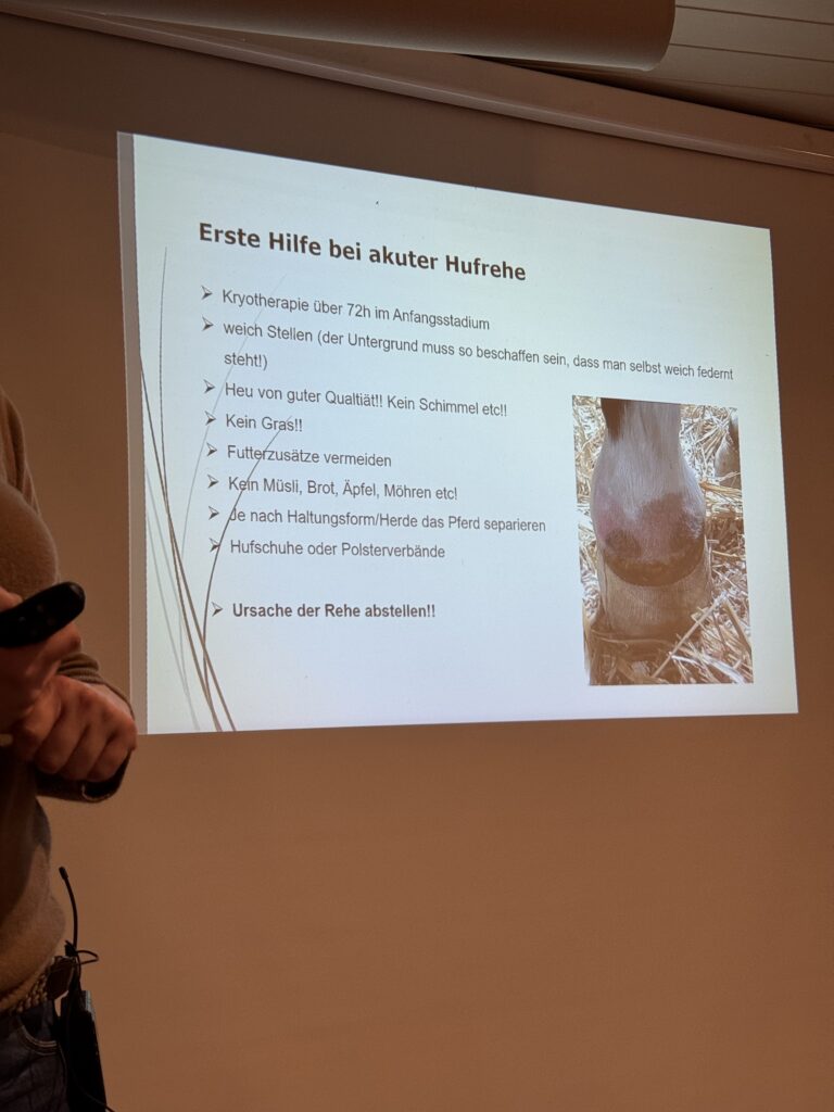 Der nächste Teil des Vortrages widmete sich dem Thema „Erste Hilfe bei Hufrehe“, denn auch hier kann der Pferdehalter schon frühzeitig sehr viel unterstützendes tun.