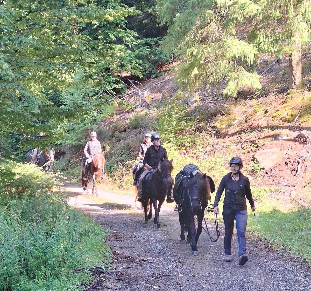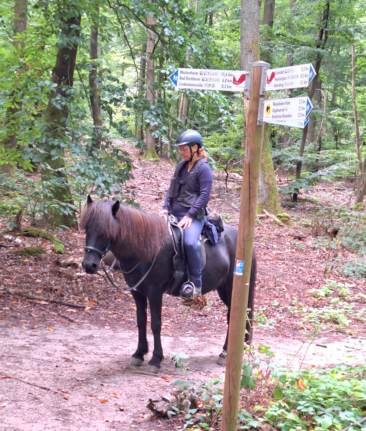 Natürlich: schöne Reitstrecken. Hier sollte man sich von den Gastgebern beraten lassen, denn einige Strecken wurden in diesem Jahr stark aufgeschottert. Aber es gibt auch noch genügend schöne Sandwege, die man aber finden muss. Unsere erste Reitstrecke führte uns über den „Toten Mann“ zum Mittelberg und durch das Langental zum Höninger Tal zurück zum Windwiesen Hof. Auf den beiden Bergen hatten wir leider einige Schotterpisten erwischt.