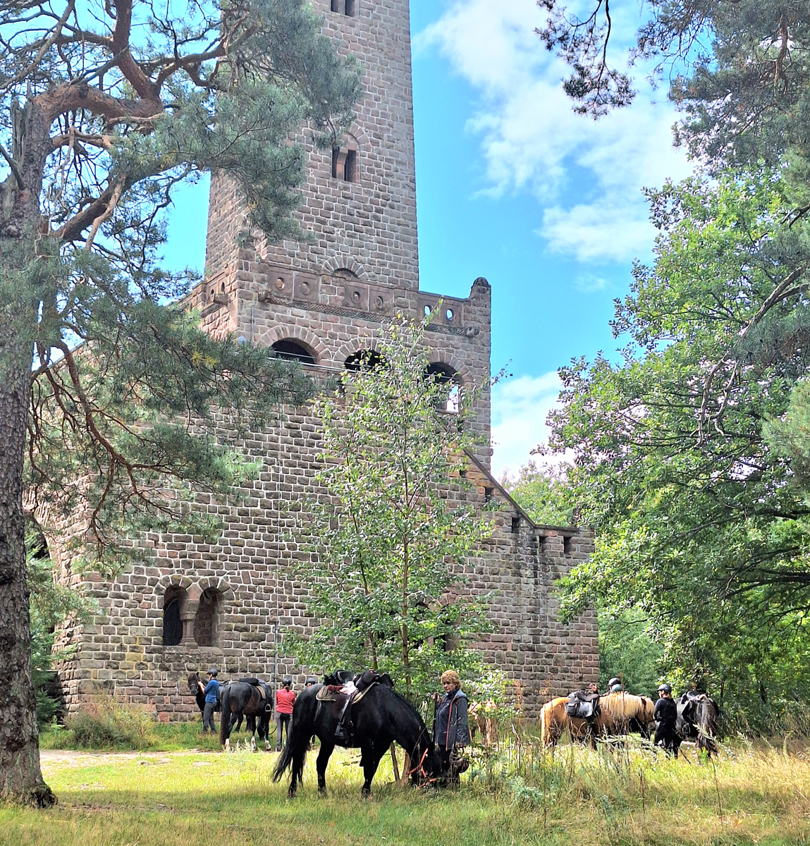 Am zweiten Reittag hatten die Reiter das Schützenhaus in Bad Dürkheim als Mittagsrast im Visier. Höhepunkt der Reitstrecke war ein sandiger ca. 3 Km langer Weg, den die flotten Reiter für einen ausgedehnten Galopp nutzten. Eine Überraschung gab es beim Anstieg zum Parkplatz der Lindemannshöhe, hier waren Bäume umgefallen. Da passte ein großes Pferd mit Stockmaß um 1,70 M nur abgesattelt durch. Am Bismarkturm durften die Pferde eine kleine Pause zum Grasen einlegen, denn von nun an wurde es schwierig. Die stetig bergab führenden Sandwege waren durch Starkregen total ausgewaschen, also wurden die Pferde geführt bis zur Wegespinne „Schlagbaum“. Von dort war es nur ein Katzensprung zur Mittagsrast. Alles was auf dem Hinweg bergab ging führte auf dem Rückweg bergan. So war manche/r Reiter/in froh, als der Windwiesen Hof in Sichtweite kam.