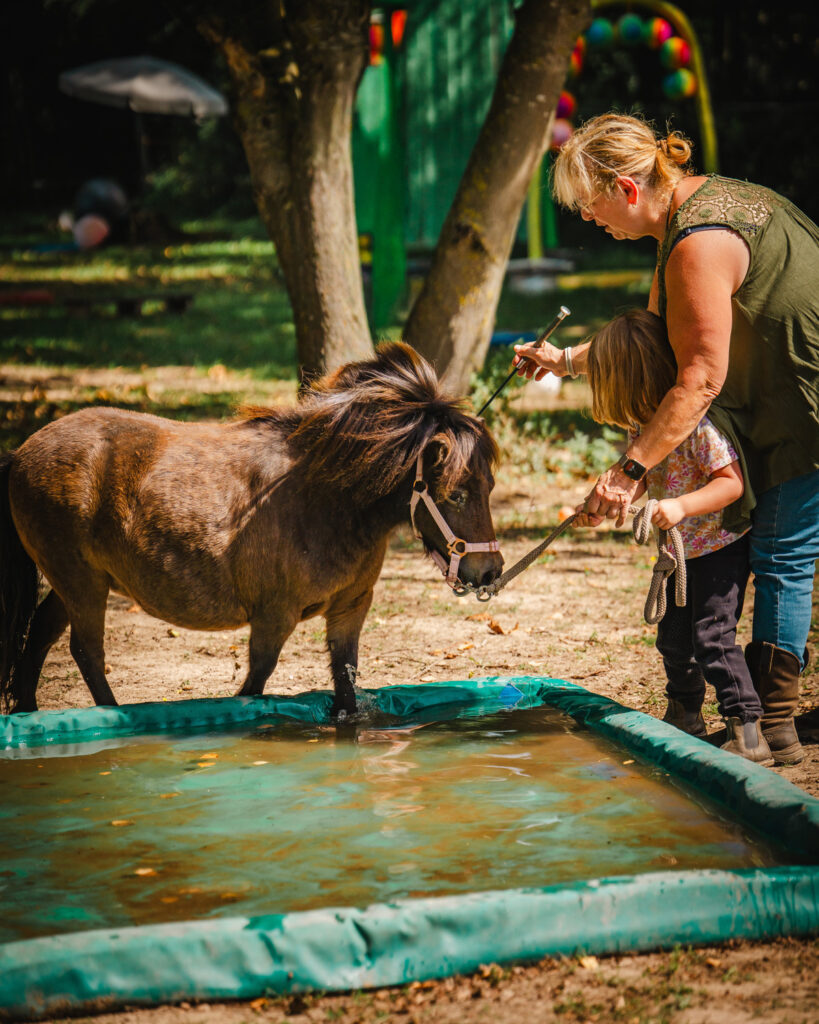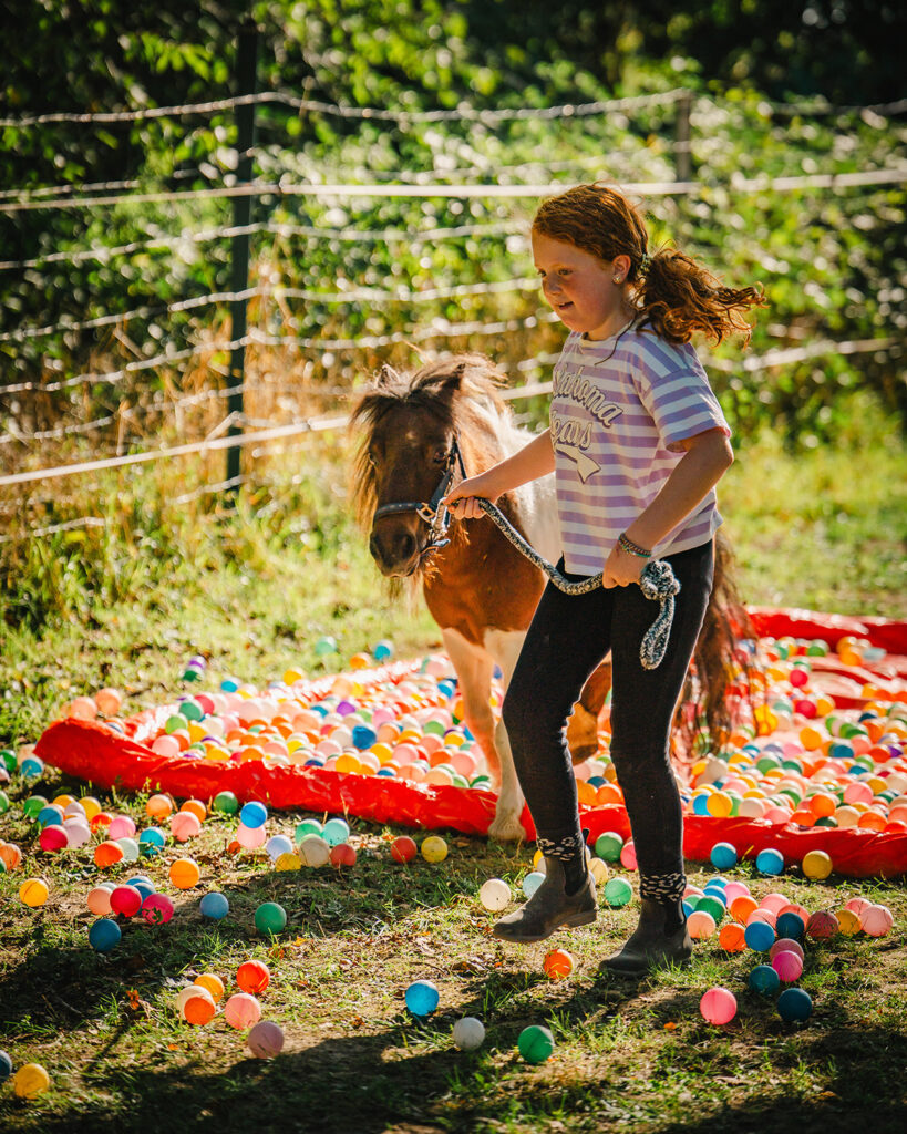 Es waren acht Kinder am Start im Alter von 4-9 Jahren. Ab 12:00 Uhr war das Treffen angesagt und die Kinder freuten sich riesig. Sie durften sich ihre Ponys aussuchen und dann ging es erst mal zum Putzplatz, wo sie hübsch hergerichtet wurden. Der erste Teil des Kurses war ein Gelassenheitskurs, damit sich alle Kinder und Ponys an die Hindernisse herantrauen und gewöhnen konnten. Dabei ging es durch ein riesiges Wasser, über eine große Rolle, ins Bällebad über eine wackelige Matratze, durch einen Flatter Vorhang einen Tunnel, auf ein Podest durch einen Engpass und zum Abschluss mussten sie mit den Ponys durch einen Reifen springen.