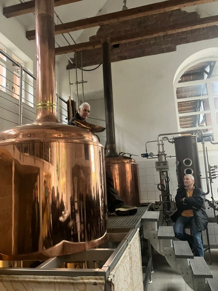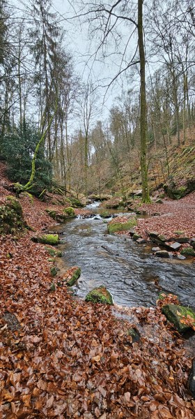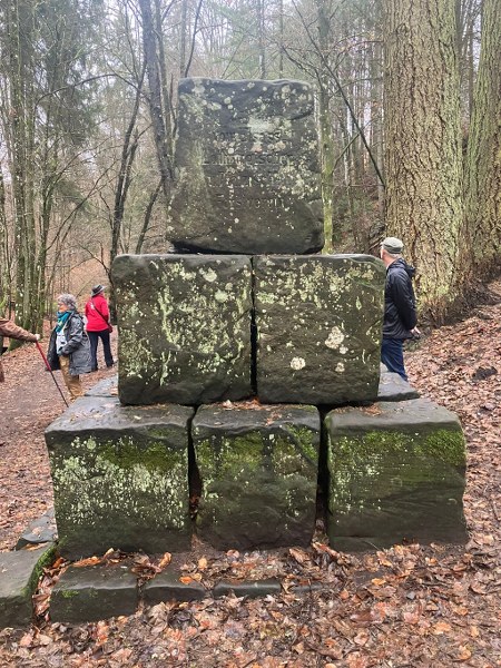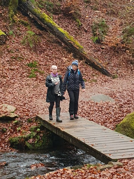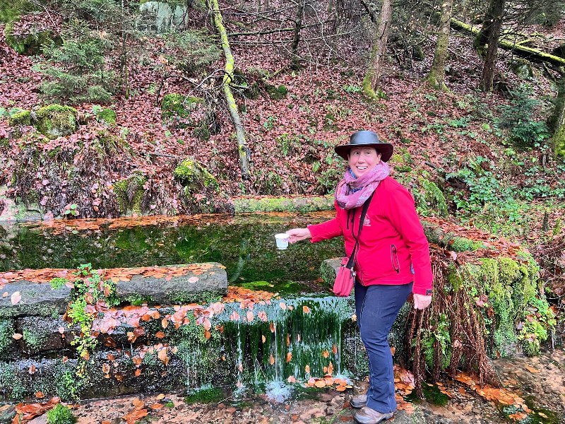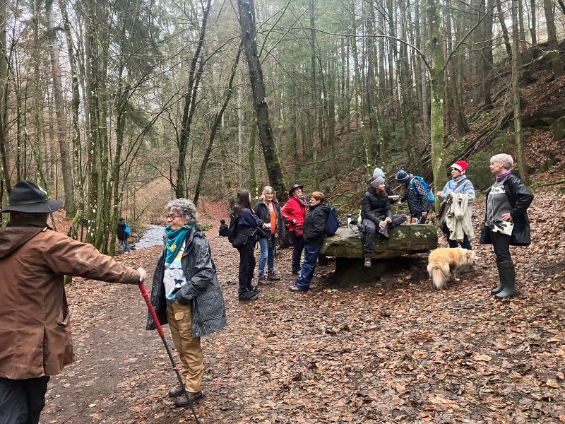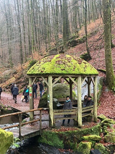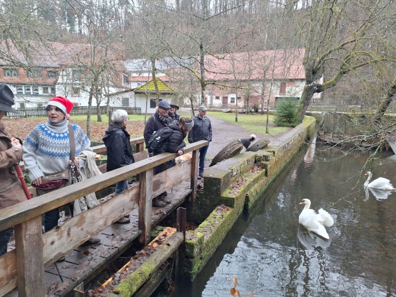 Die VFD-ler fanden wie immer eine Lösung und weil so viele mit Schirm und Cape anrückten, streckte der Wettergott die Waffen und ließ es vorerst trocken bleiben. Treffpunkt war der Parkplatz vor dem Cafe Unterhammer in der Nähe von Kaiserslautern. Der Empfang durch unsere Pfälzer Vereinskameraden war sehr herzlich und wurde unterstrichen durch eine super-mega Bewirtung: Kuchen, Salzgebäck, Plätzchen und jede Menge Getränke für jede Fasson. Die Stimmung war prima und das waren ideale Voraussetzungen für die Wanderung. Gleich als erstes kamen wir zum Jungbrunnen. Dort nahm jeder einen Schluck und so waren wir bestens gerüstet für den langen Weg. Es wurden unglaublich viele Worte gesprochen, doch dann übernahmen die „Aaahhhs“ und „Ohhhs“ die Überhand. Die Schönheit dieser wildromantischen Schlucht, in der die „Moosalbe“ fließt, macht wirklich sprachlos und bietet ein wunderbares Naturerlebnis mit seinen Sandsteinfelsen. Schaut euch die Bilder an, ihr werdet staunen! Die 6 km schaffte jeder ohne Mühe, die Pausen waren eigentlich nur zum Gucken. Als wir pünktlich zur Brauereibesichtigung eintrafen, fing es an zu regnen. Ganz wie bestellt! Statt einer Weihnachtstüte hatte sich der Vorstand in diesem Jahr dafür entschieden, diese Besichtigung zu sponsern. Das erwies sich als eine gute Idee. Die Tour war interessant und kurzweilig und da der Herr mit holländischen Dialekt sprach, war auch alles irgendwie ein bisschen spaßig! Er erzählte uns nebenbei von der Geschichte dieses Industriedenkmals, in dem vor Jahr und Tag fünfzehn Wasserräder an der „Moosalbe“ entlang eine Eisenproduktionsstätte am Laufen hielten.